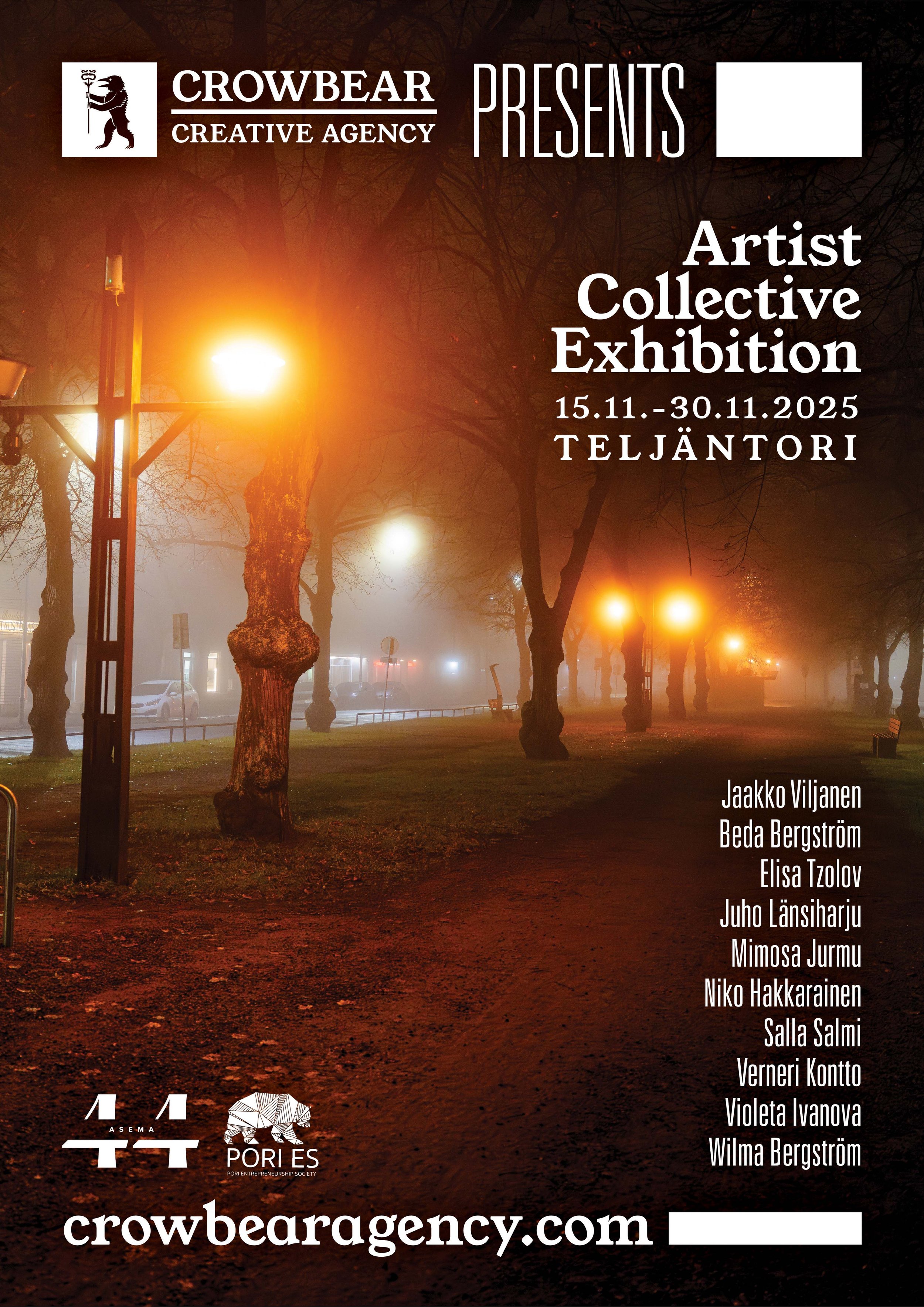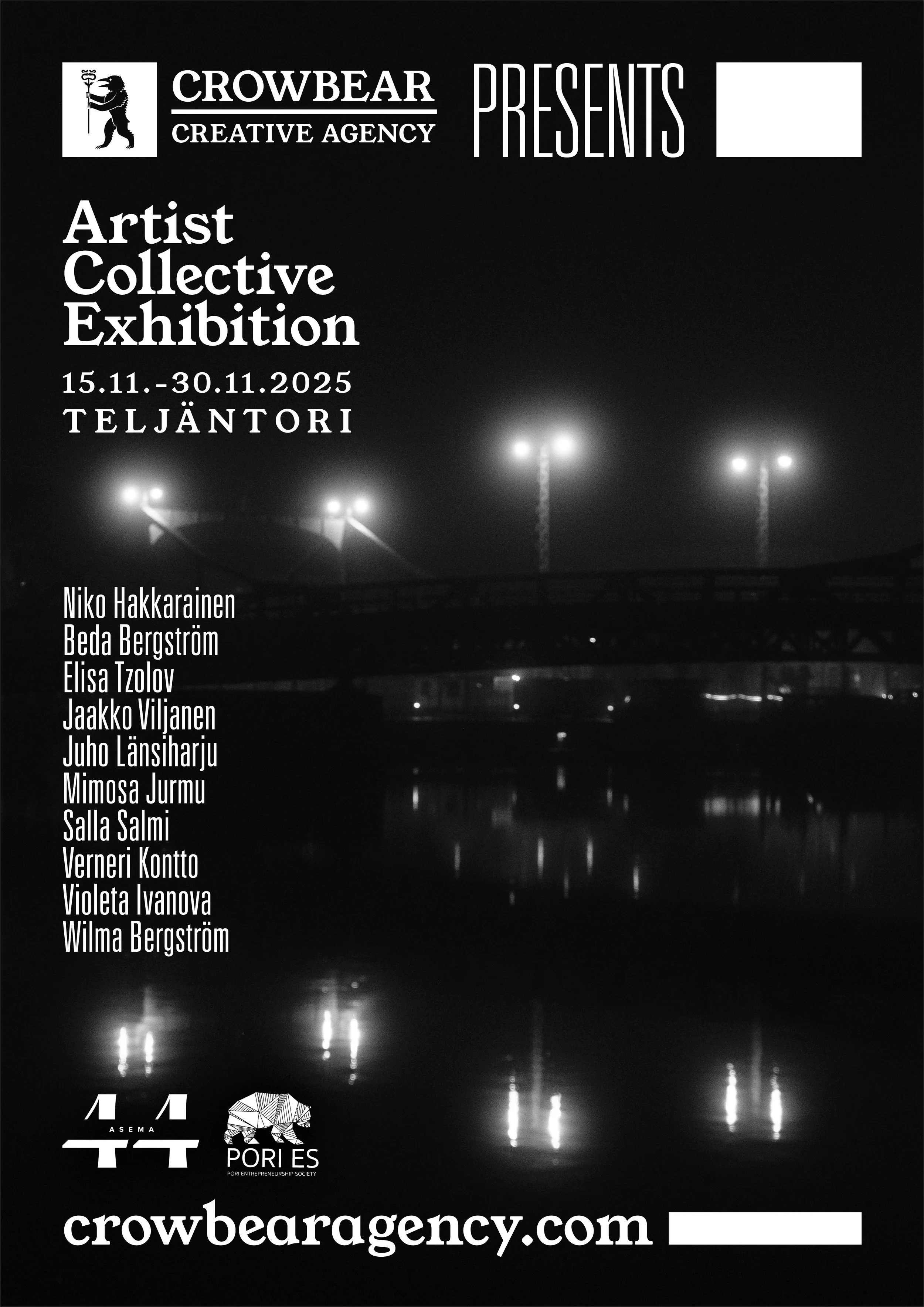 CROWBEAR CREATIVE AGENCY PRESENTS:ARTIST COLLECTIVE EXHIBITION 15.11.-30.11.2025Teljäntori, Pori During the week 12:00 -18:00 Saturday 12:00-0:00